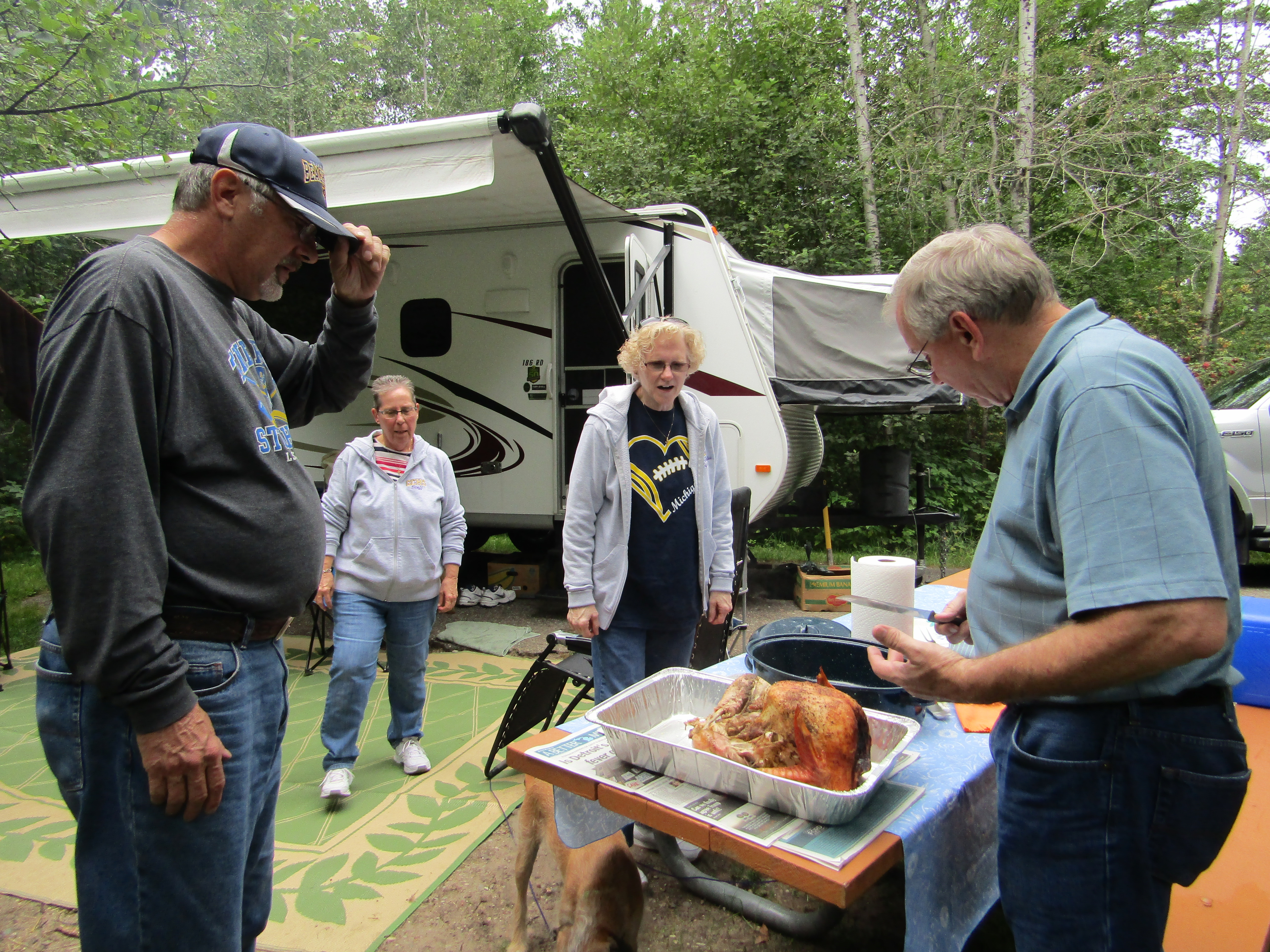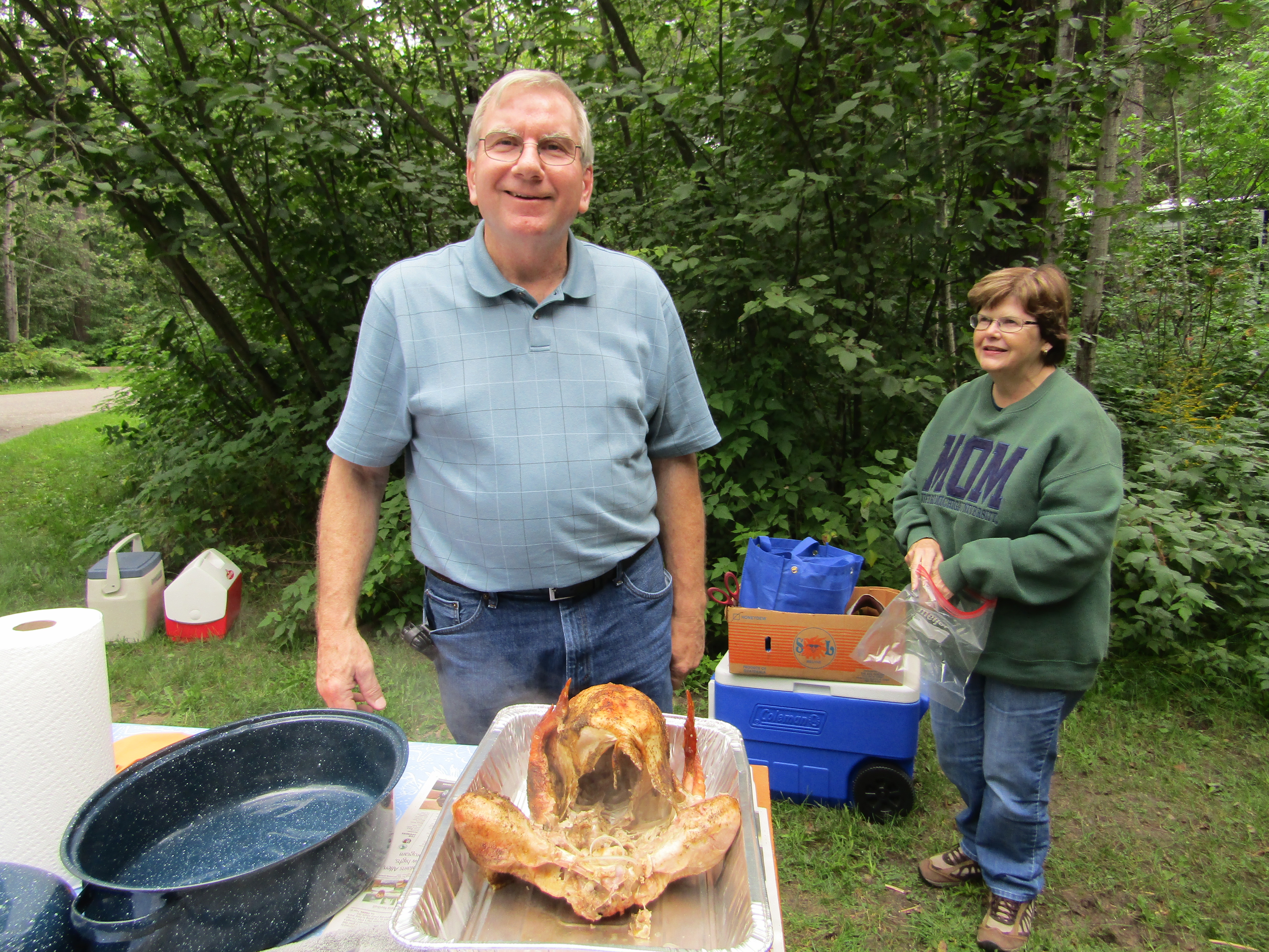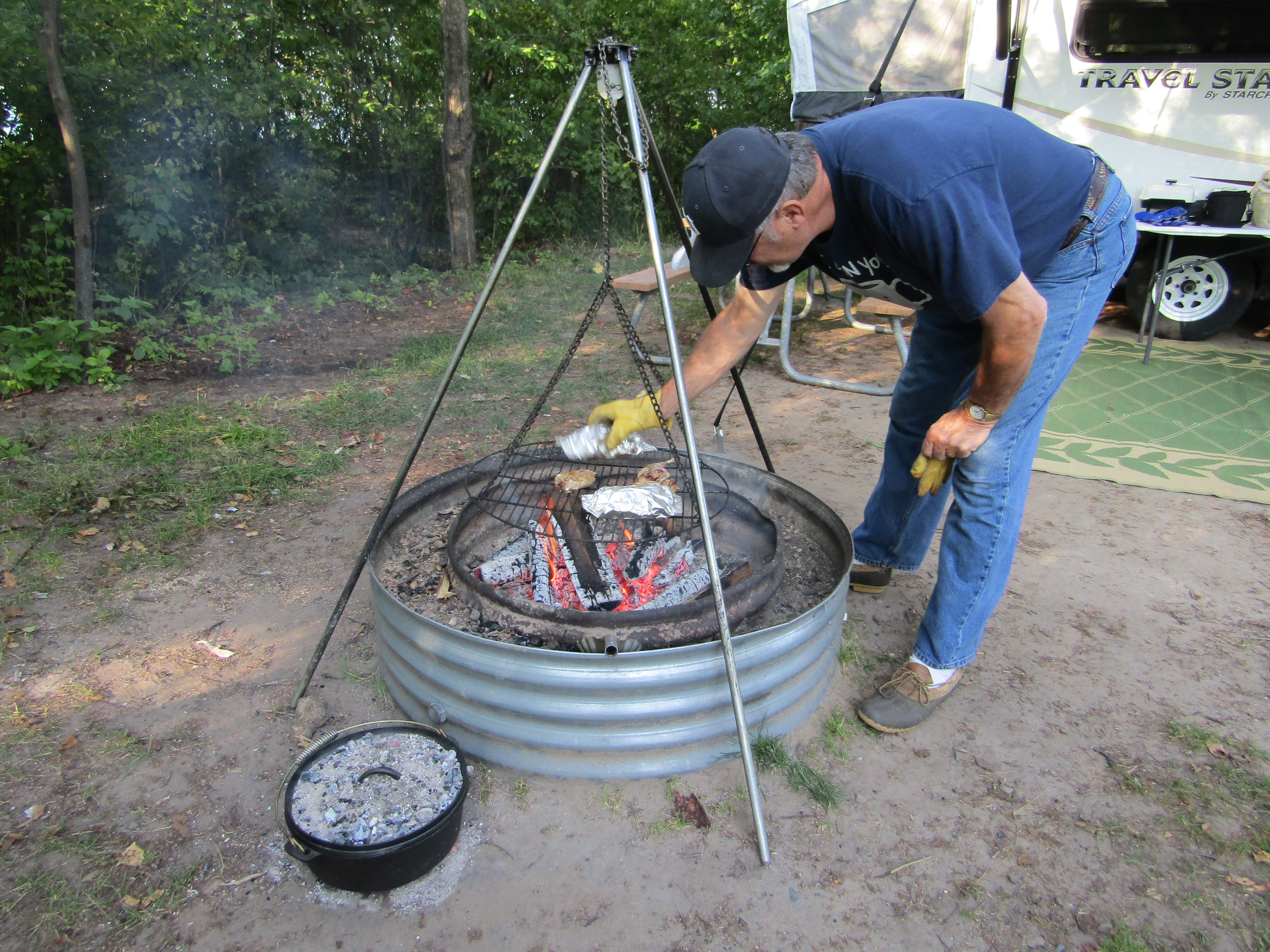We camped at Harwick Pines State Park and invited the Thomas Clan. Dan came and taught us how to cook a turkey under a trashcan. It was fabulous! The weather was perfect and nobody went again hungry. Not even Murphy. I practiced cooking in the dutch oven by baking a pan of brownies. We had entertainment too, it was the annual Black Iron Festival with lots of blacksmiths and other craftsmen plying their trades.