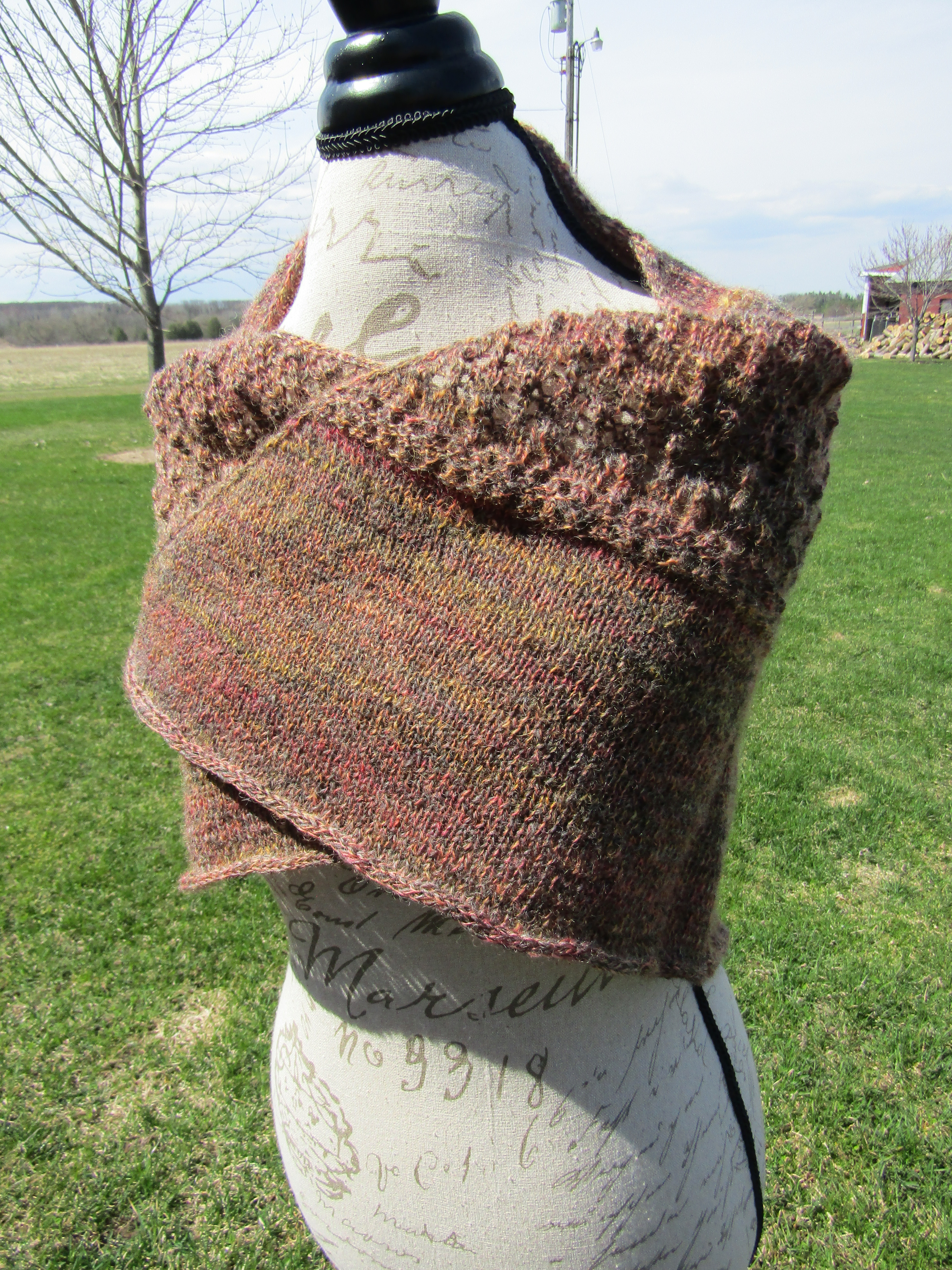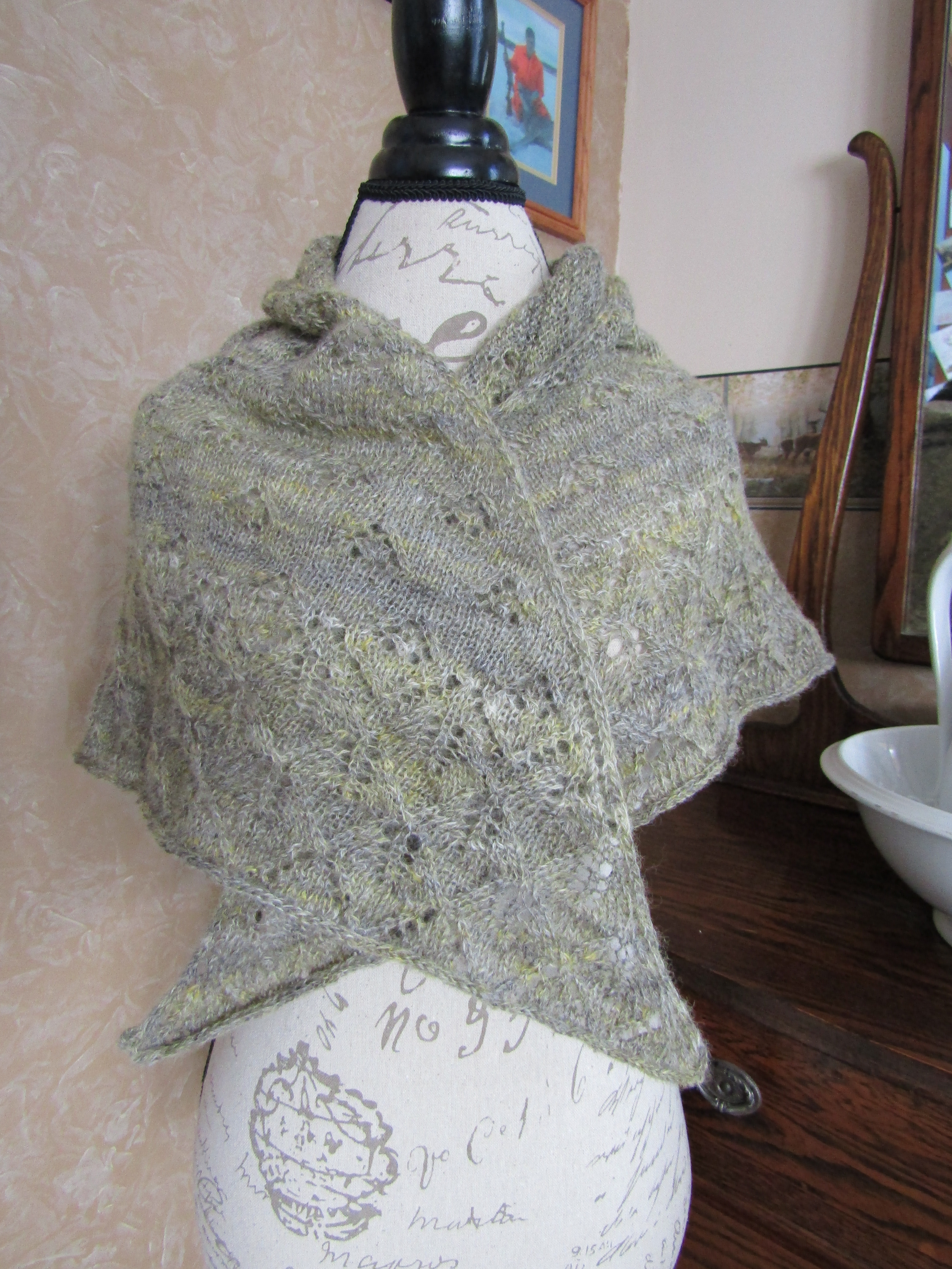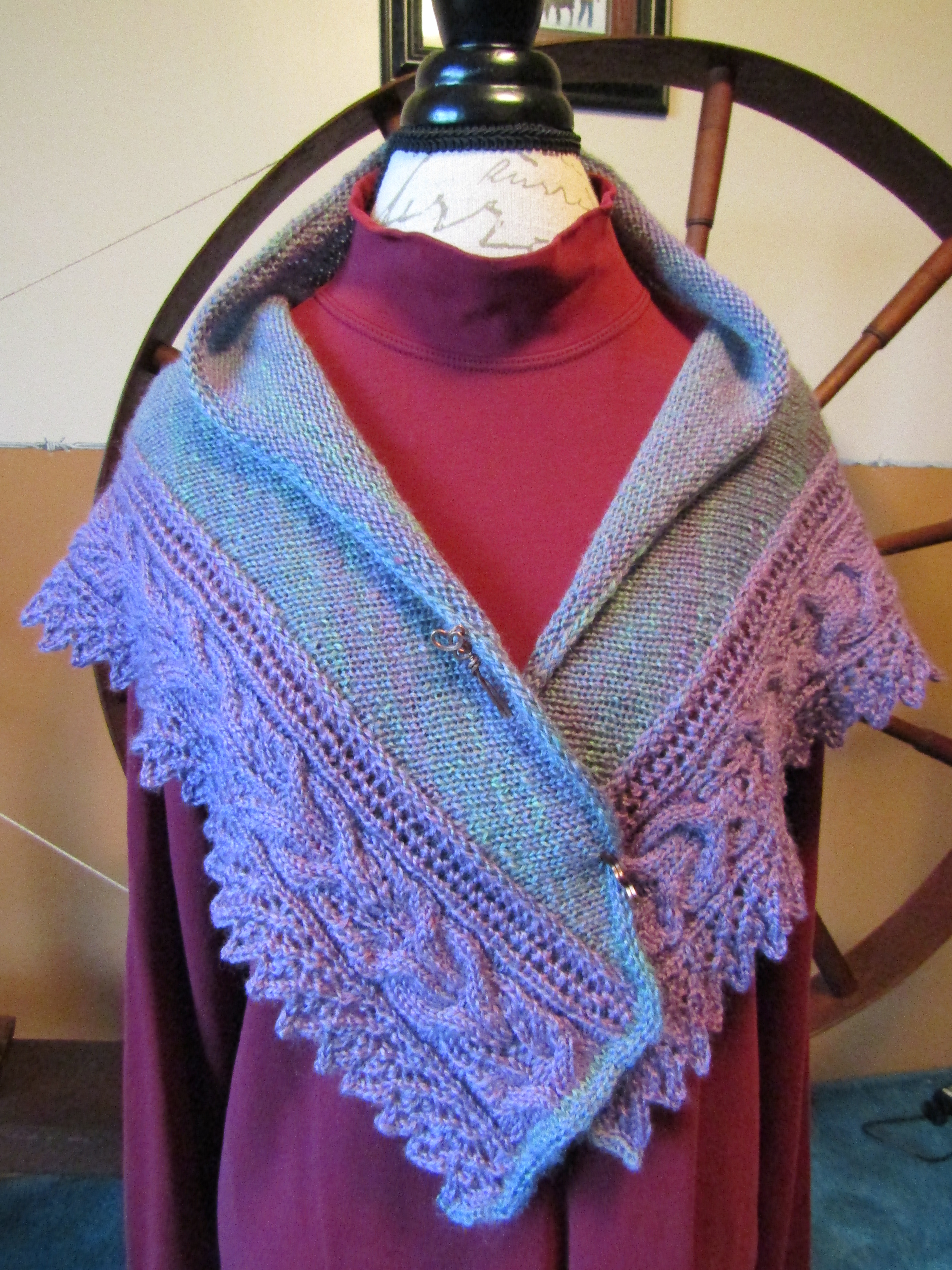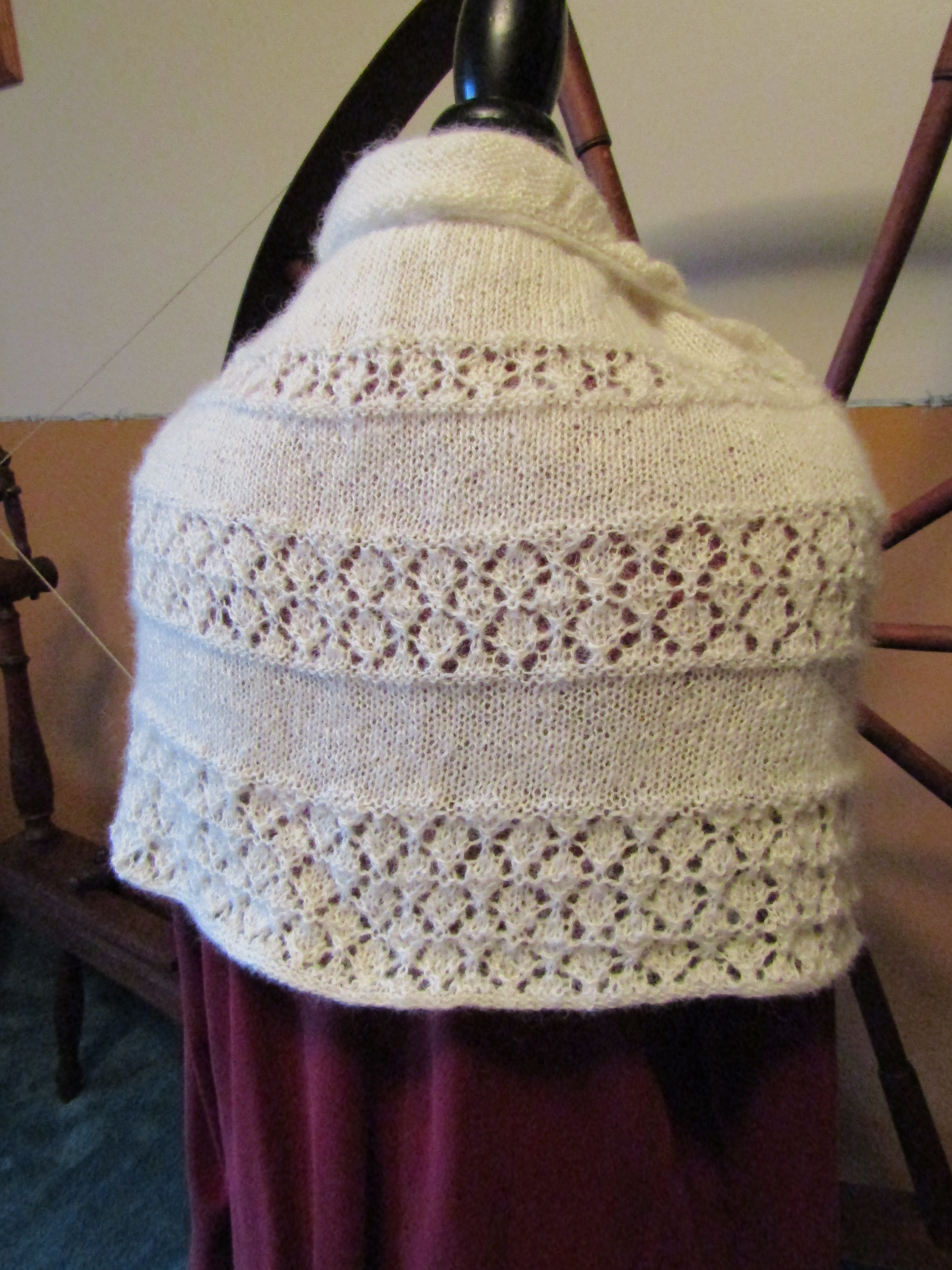 But her love of fibers combined with her love of history brought her focus back to spinning and in 2020 she started collecting and refurbishing antique spinning wheels. She currently has five antique wheels – all functional – from a Revolutionary War era Great Wheel (in the photos with the shawls below) to a small early 1900’s Hutterite parlor wheel.